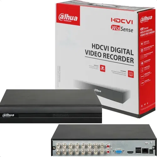 Grabador de video digital híbrido (XVR) de la marca Dahua para 16 canales. Soporta cámaras de hasta 5MP y tecnologías de video analógico de alta definición (HDCVI, AHD, TVI, CVBS) y cámaras IP.