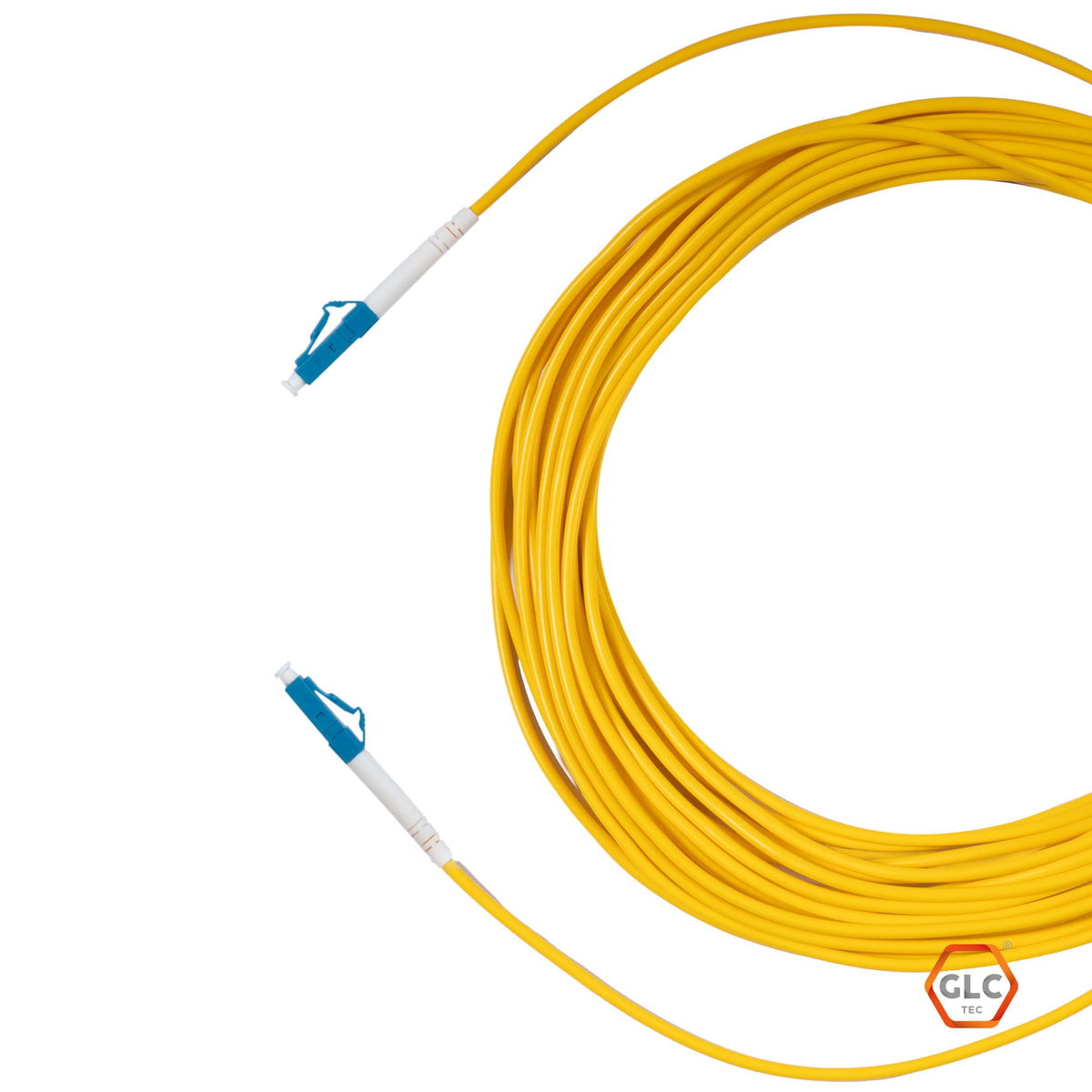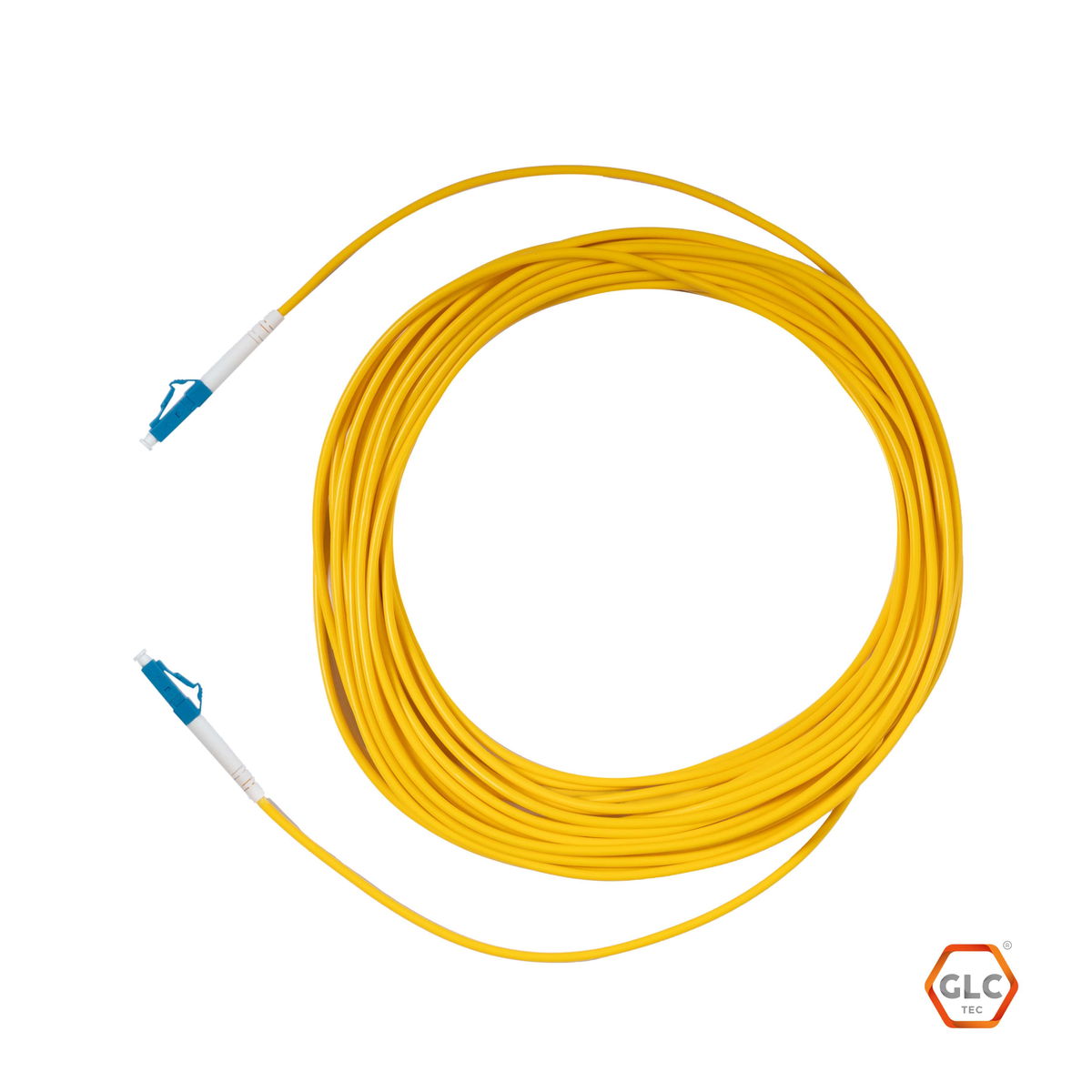 Cable de conexión de fibra óptica monomodo de 20 metros con conectores LC/PC en ambos extremos, para interconexión en redes de transmisión de datos.