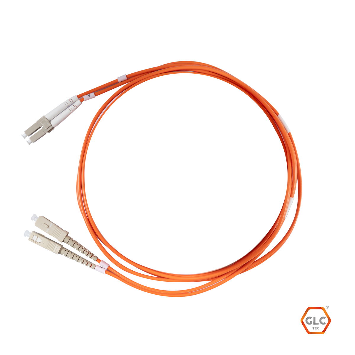 Cable de conexión de fibra óptica multimodo OM2 de 3 metros con conectores híbridos SC/PC y LC/PC en configuración duplex.