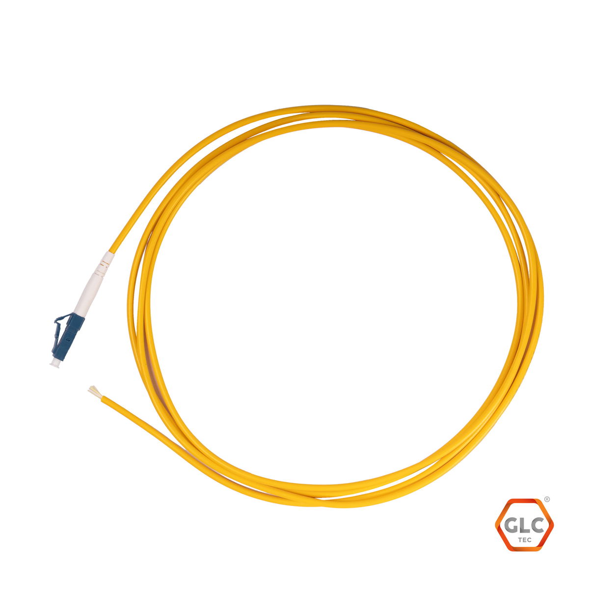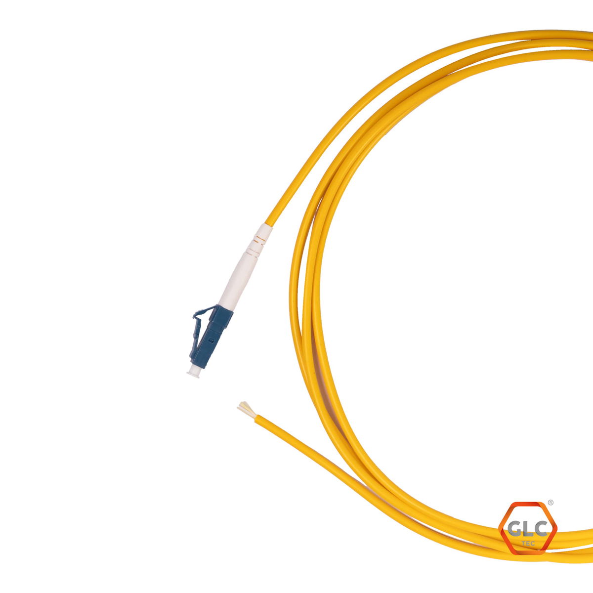 Pigtail de fibra óptica de 2 metros, con un conector LC en un extremo. Es de tipo monomodo (SM) y se utiliza para empalmar con cables de fibra óptica en cajas de distribución.