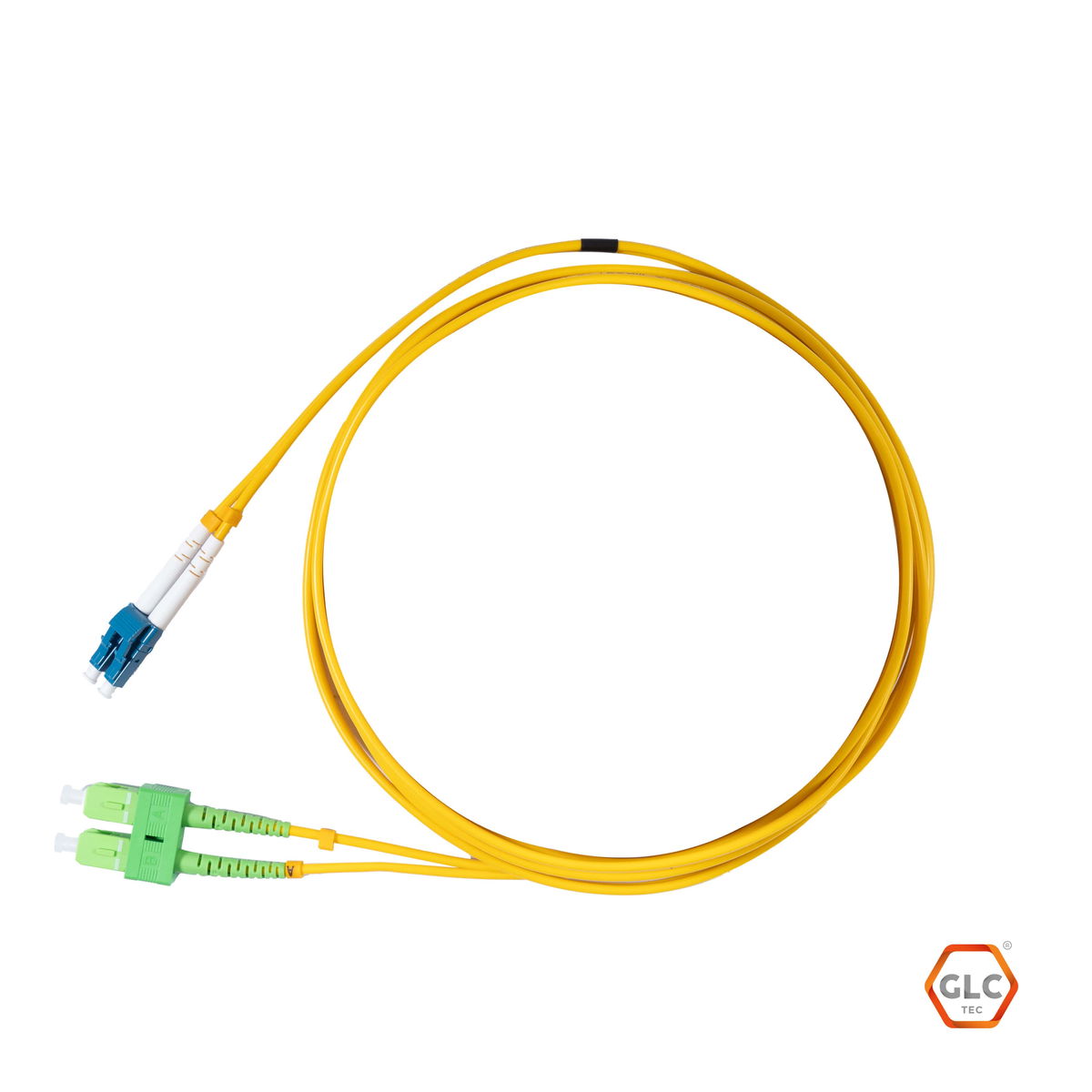 Cable de conexión de fibra óptica de 3 metros, con un conector SC/APC en un extremo y LC/PC en el otro. Es dúplex (dos fibras) y está diseñado para transmisiones de fibra monomodo (SM).