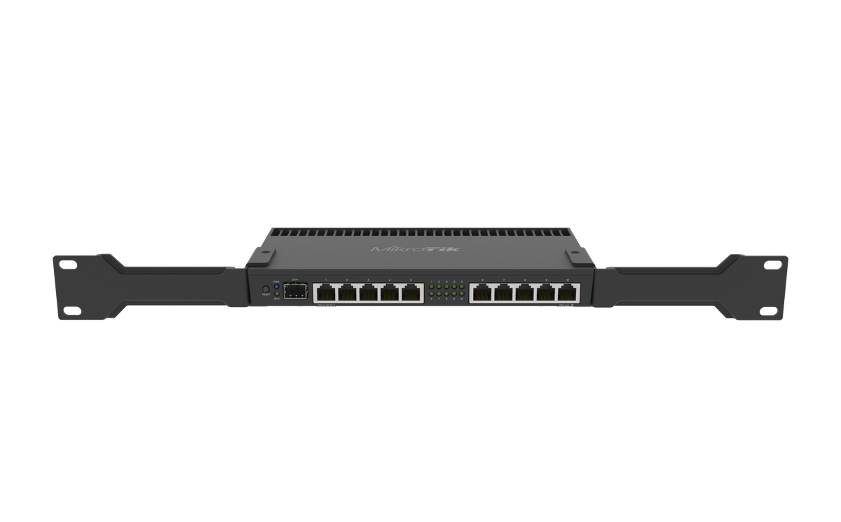 Router de 10 puertos Gigabit Ethernet y una jaula SFP+ de 10 Gbps, ideal para redes domésticas o de oficina de alto rendimiento. Se presenta en un chasis de rack.