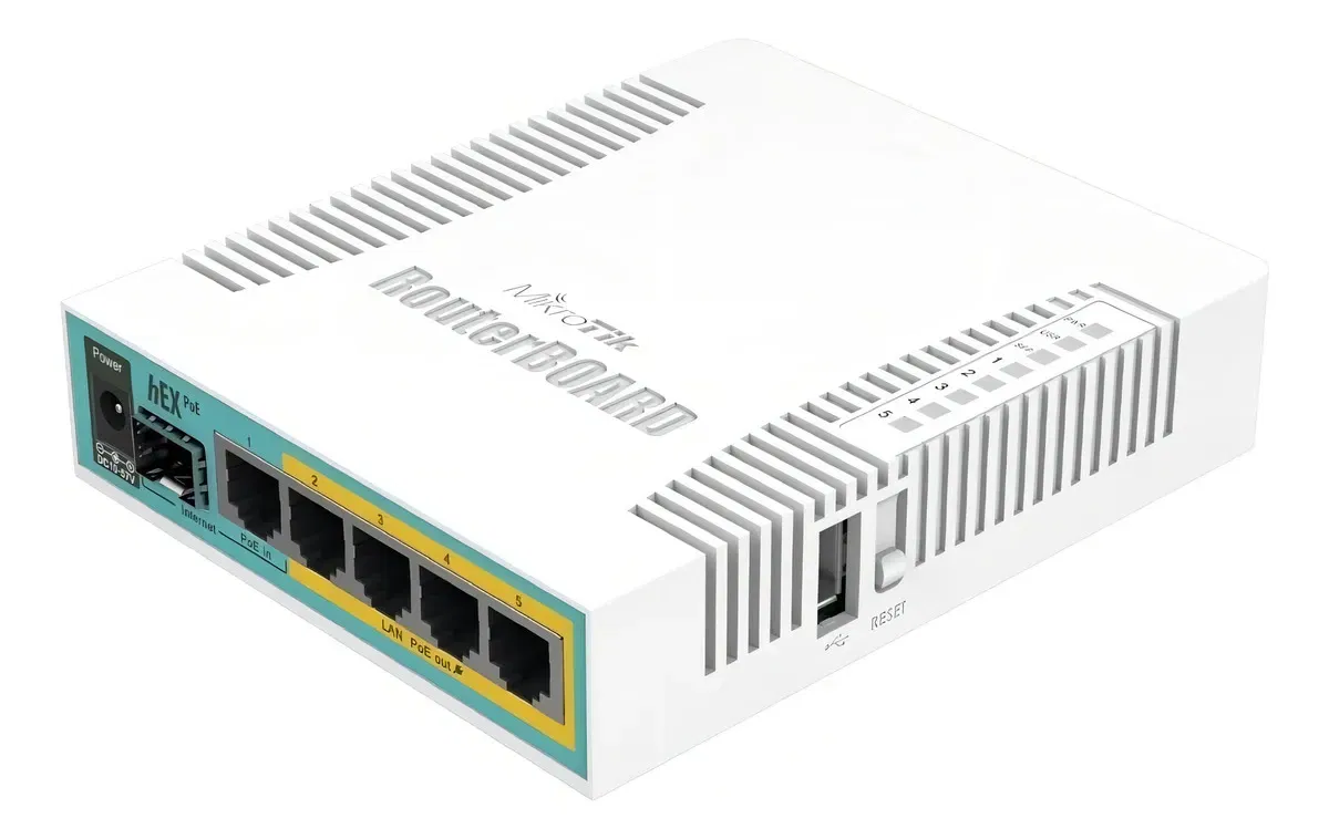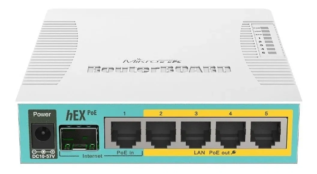 hEX PoE es un enrutador Gigabit Ethernet de cinco puertos para ubicaciones donde no se requiere conectividad inalámbrica. El dispositivo tiene un puerto USB 2.0 y un puerto SFP para agregar conectividad de fibra óptica. Los puertos 2-5 pueden alimentar otros dispositivos con capacidad PoE con el mismo voltaje aplicado a la unidad.
