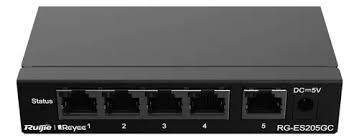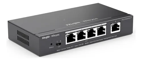 Switch gestionable de la marca Ruijie, modelo RG-ES205GC-P, con 4 puertos PoE+ Gigabit y 1 puerto de enlace (uplink) Gigabit. Su presupuesto de energía PoE es de 54W, ideal para alimentar múltiples dispositivos.