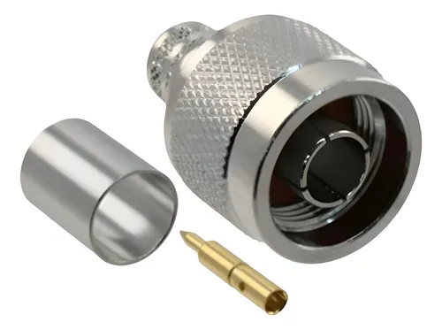 Conector tipo N Macho: Es un conector roscado, robusto y estanco, diseñado para aplicaciones de alta potencia y frecuencia. Su diseño con mecanismo de tornillo garantiza una conexión segura y de baja pérdida, lo que lo hace ideal para entornos industriales o de exteriores.