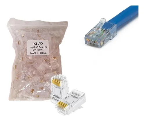 Conectores o fichas RJ45 de la marca Kelyx, diseñados para la terminación de cables de red Cat.6. Son ideales para armar cables de red (patch cords) y garantizar una conexión de alto rendimiento.